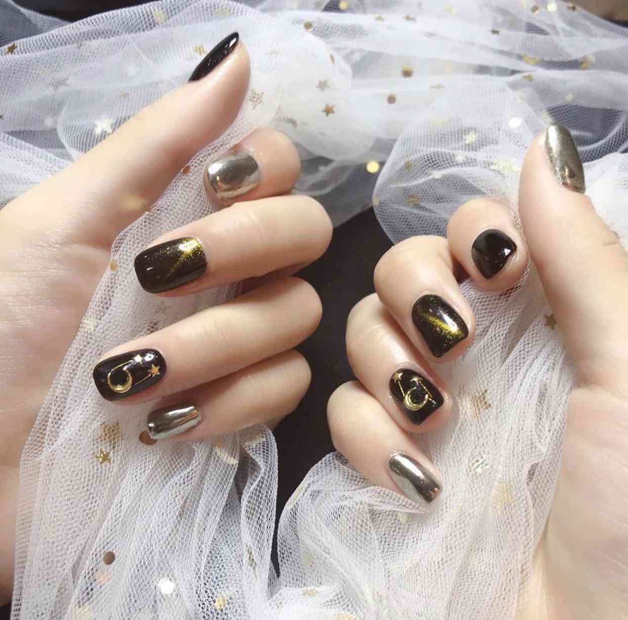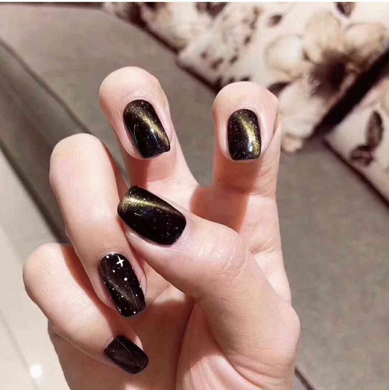 最后压轴的,当然就是大家都知道的黑色猫眼甲啦~黑色猫眼甲有着非常神秘的质感,会非常有魅力,既性感又很酷,真的很有魅力哦~尤其是这样的金光猫眼,金色的光泽感和黑色形成对比,会显得非常抢眼。