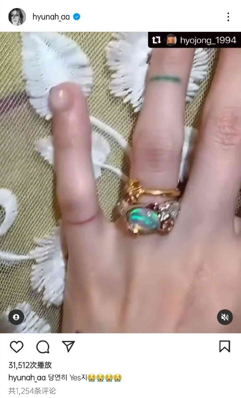 随后,泫雅在社交平台回应:“Yes”,答应了金晓钟的求婚。