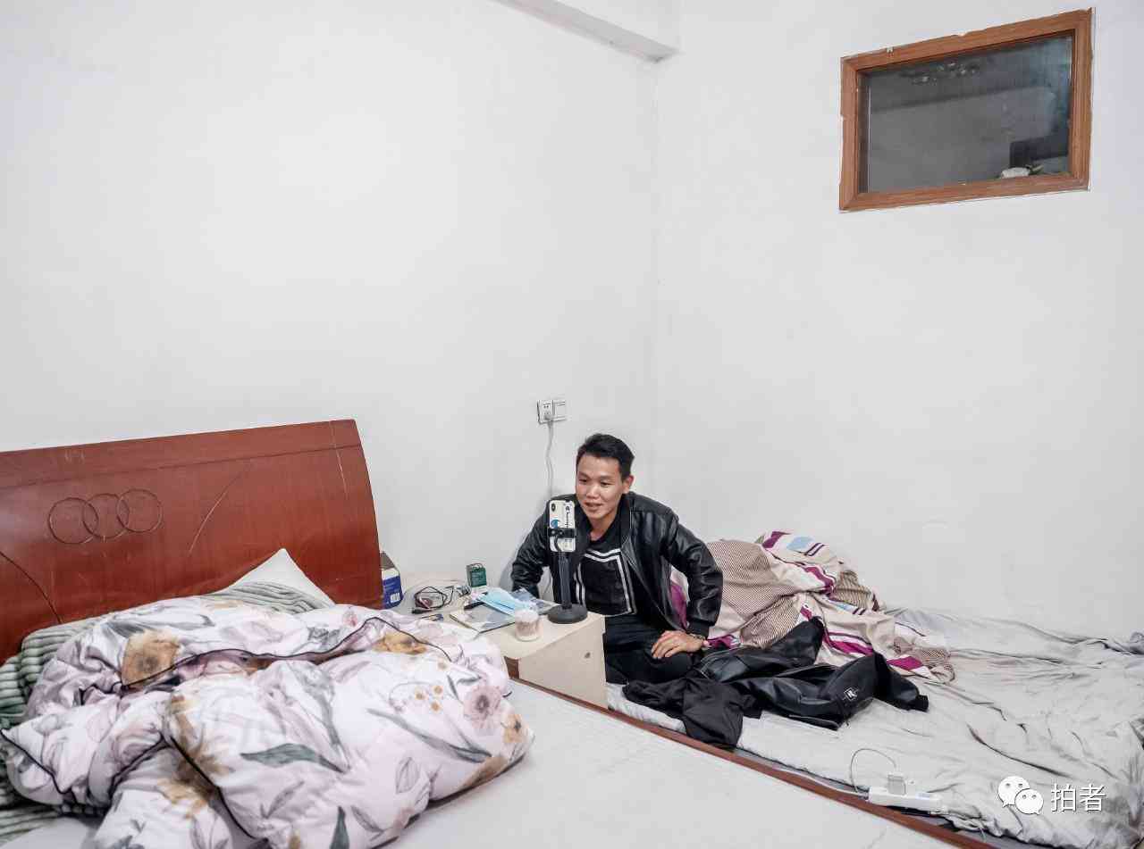 △ 36岁的何祥珠与搭档同睡地铺。晚8时,他坐在床边,卖力地直播着,他当晚主推69元的皮衣,何祥珠判断,如此物美价廉的皮衣必定会有好的销量。