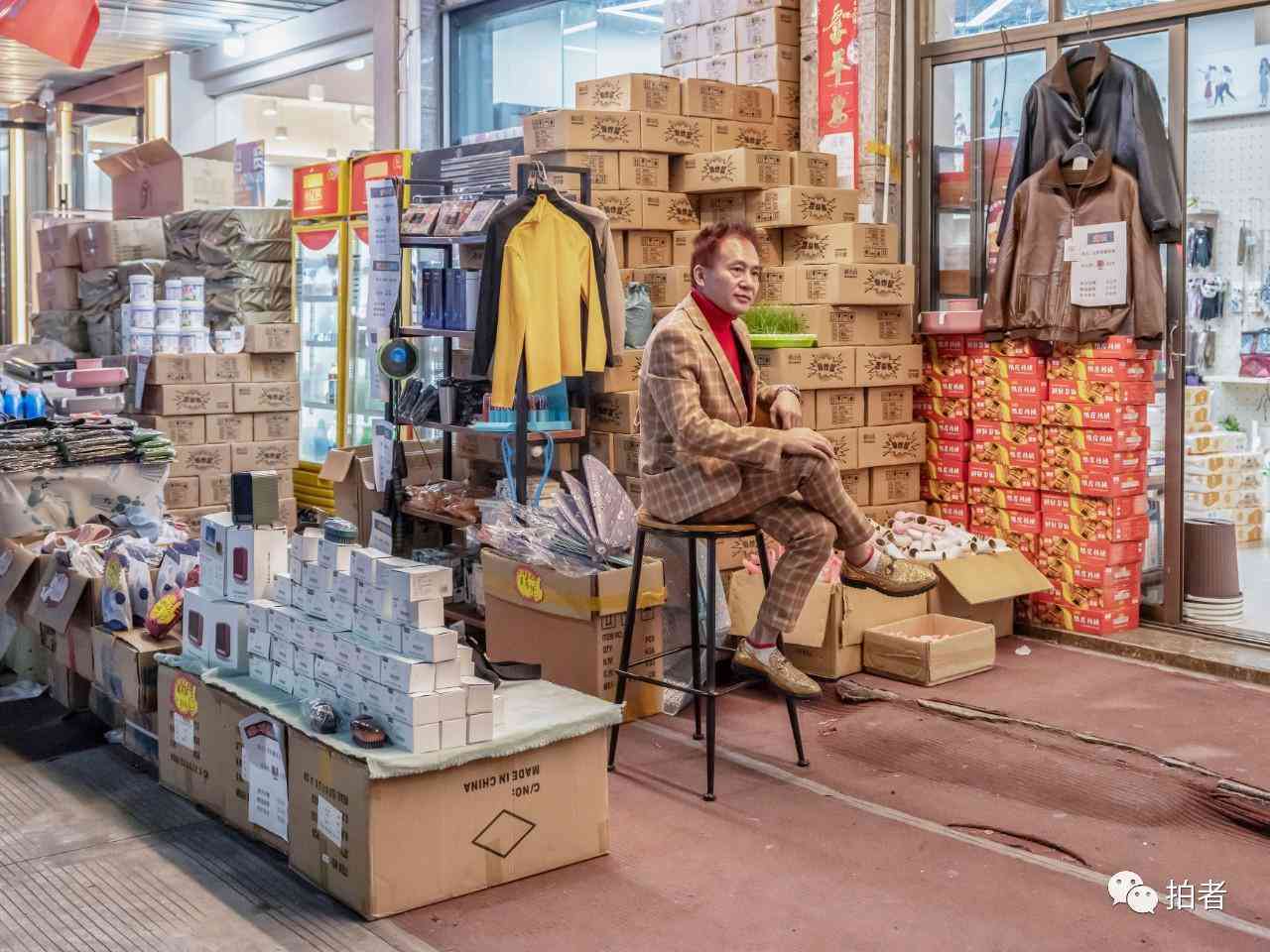 △ 54岁的钟芝友身穿西服坐在一家商户门前。两小时前,他在此完成了自己的直播首秀。他说,自己过去从事演艺工作,现在看好直播带货,这次是下了决心,想从头学起。