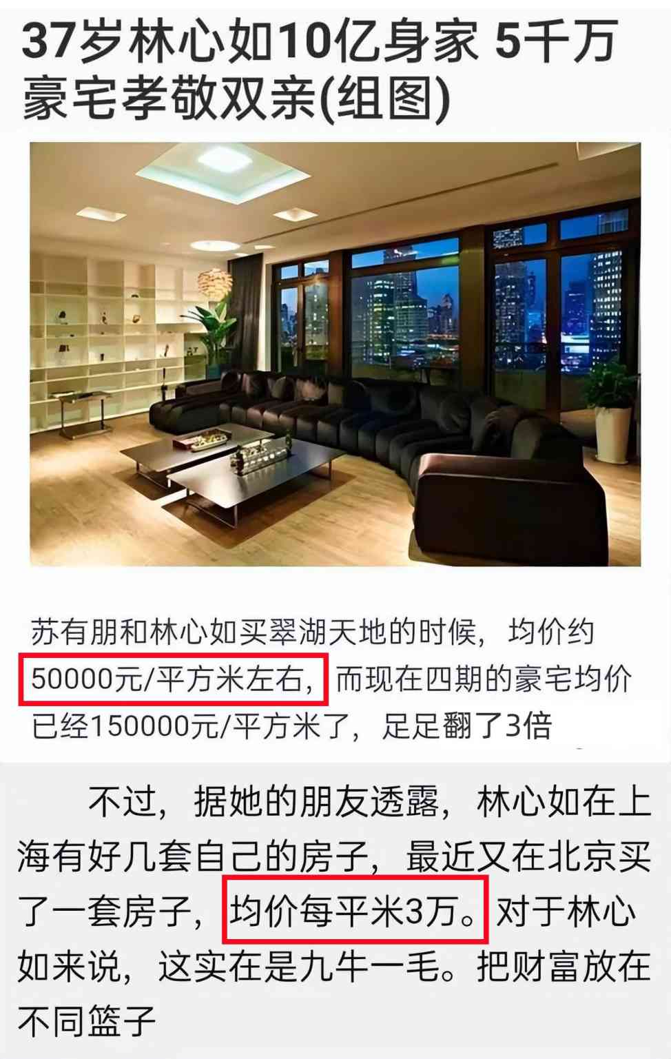 当年林心如在爆红后做的件事就是帮父母在台湾买房子,后来因为长期在内地拍戏,她又相继在北京、上海购入豪宅。