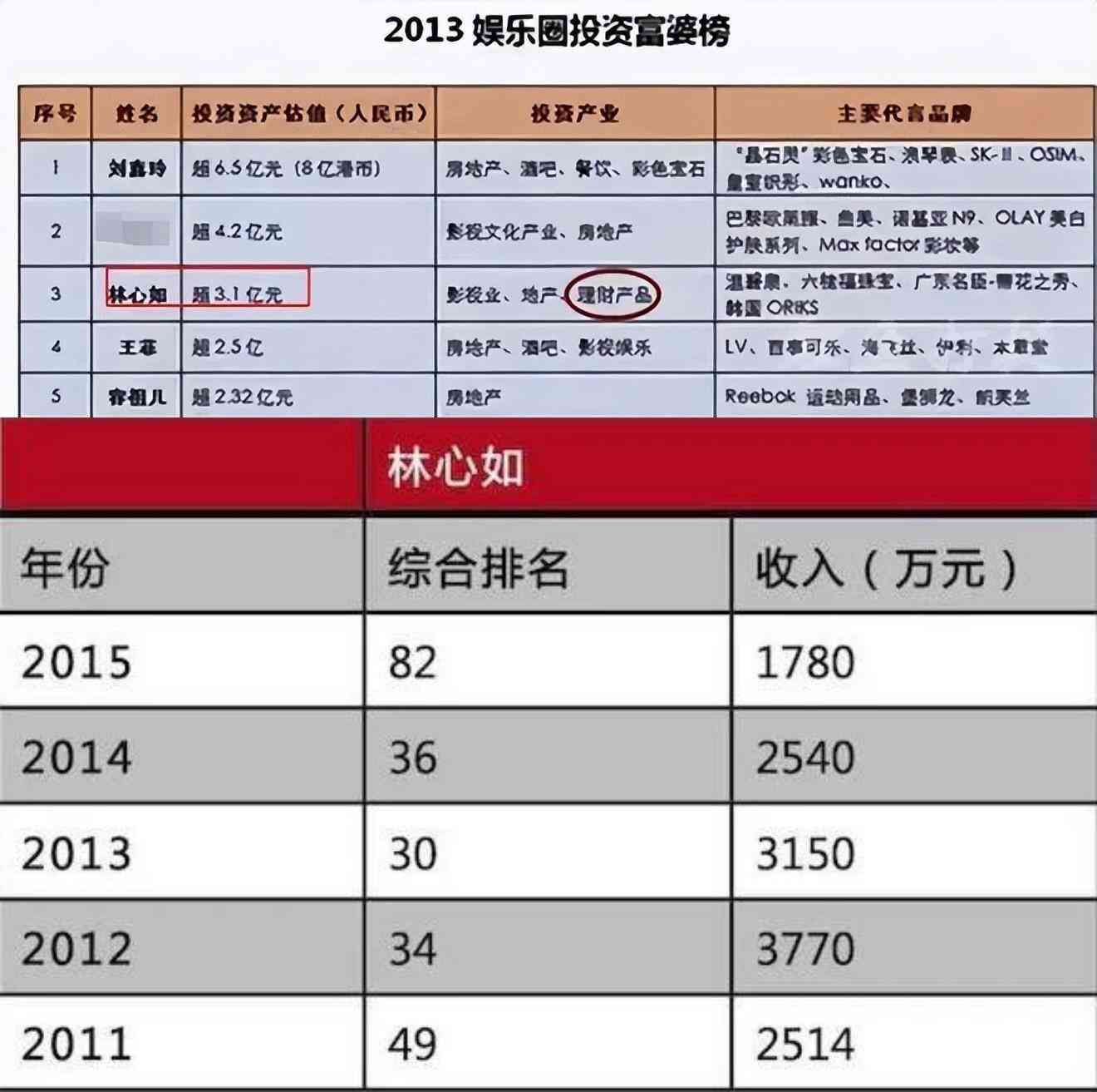早在2013年,林心如就以3.1亿的身家,成功入选娱乐圈投资富婆榜,保守估计当时她的资产就已经超过10亿。