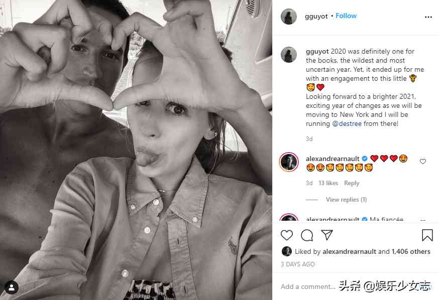 宣布订婚后,Guyot透露,自己之后会跟着未婚夫一起搬到纽约定居。