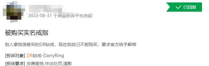 但目前,DR的品牌理念遭遇了信任危机。2021年,有自称DR钻戒内部人士爆料称查到了几位男艺人的购买记录,后调查实则为有粉丝盗用偶像身份信息为自己购买DR钻戒。此事件也让号称男士需凭身份证购买的DR钻戒陷入信任危机。此外,黑猫投诉平台上,也有消费者投诉称,有人拿自己的个人信息购买DR钻戒,自己发现后无法解绑。