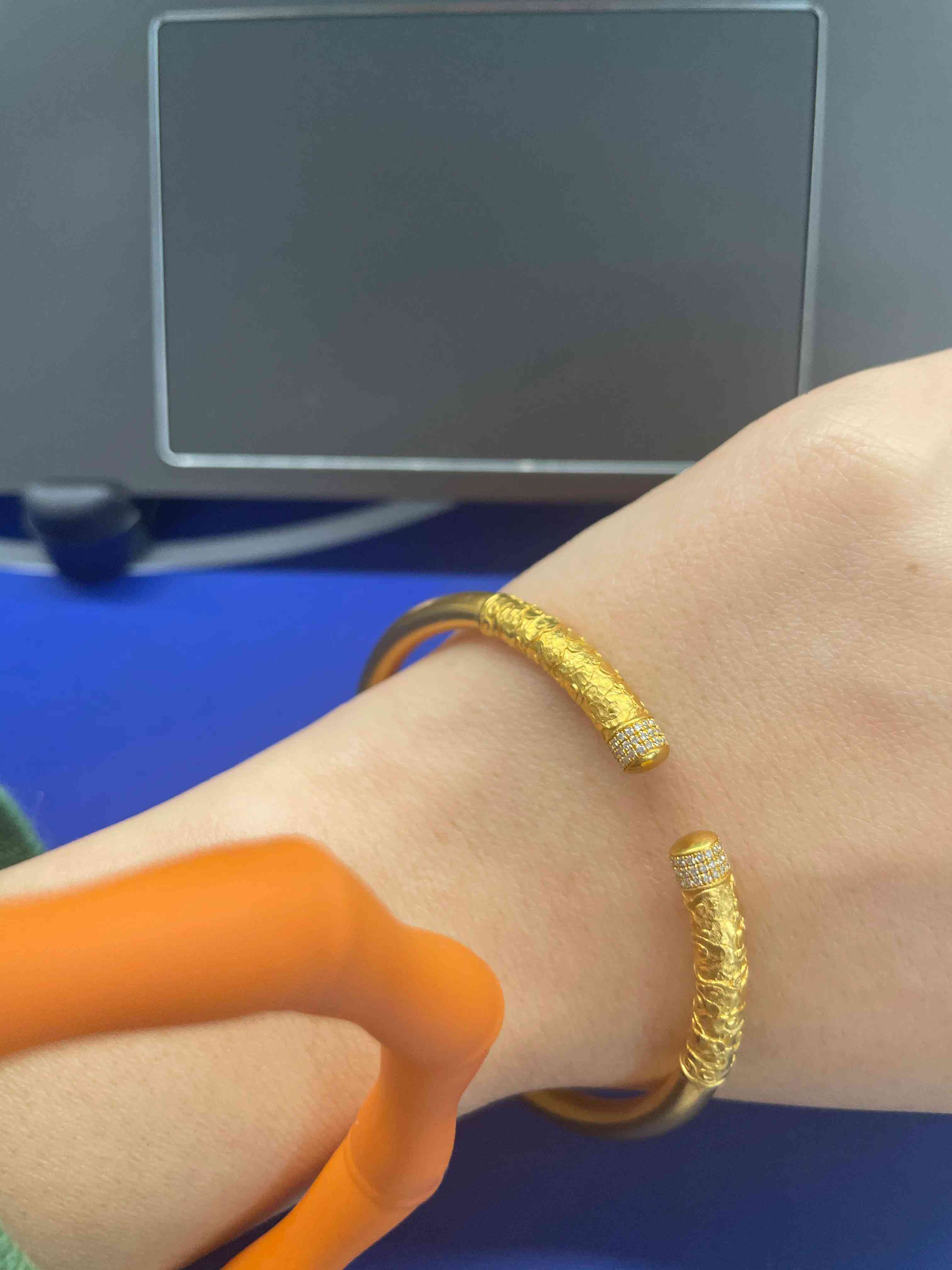 其次,当今市场对古法金的认同感最高。佩戴首饰,本身就是为了悦己和获得身份认同。古法金饰这些年带动了90后甚至00后对黄金的消费热情,佩戴古法金不但不土气,还很时髦,当然令主人开心了。此外,金饰最怕频繁摘取中遗失,因此很多人的手镯 项链 戒指长期不摘的,古法金由于克重较大,厚壁或者实心居多,即使长时间佩戴也不容易变形。当然,我也见过很多人提到古法金镯戴久了之后磨砂感减弱,甚至有了划痕。这个我认为属于岁月的痕迹,无可避免,也不用太在意。总比我那些彩色宝石的首饰,到家就摘,定期涂婴儿油保养方便吧。