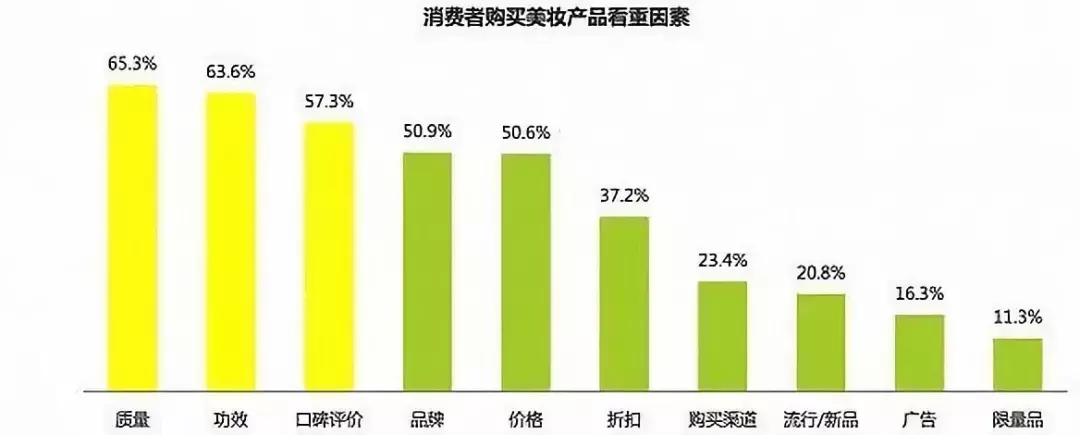 数据显示,质量、功效、口碑评价时消费者购买美妆产品是最为看重的因素,而流行、广告等则排在末位,这也正是品牌长久的生存之计。