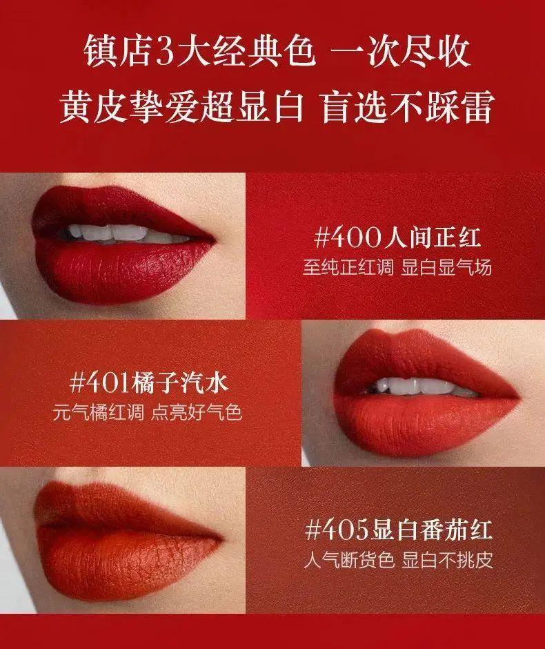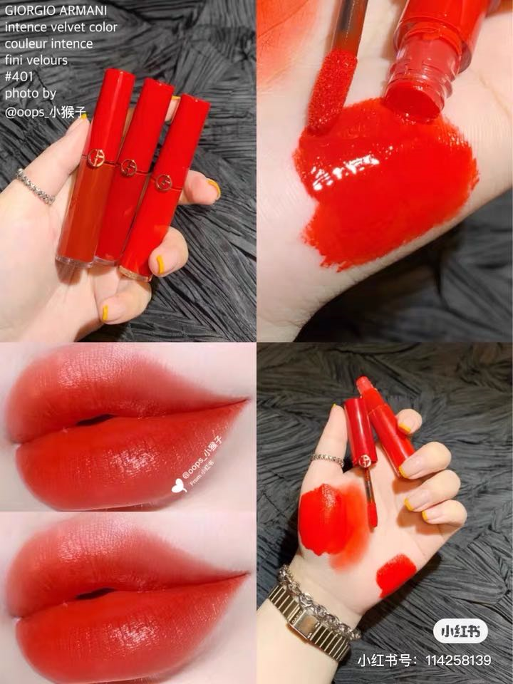 礼盒中都是阿玛尼的断货、热门色号:#400阿玛尼正红+#401元气橘红+#405人气烂番茄色。