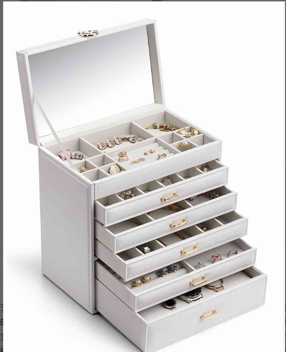 女生的首饰很多,大多数都缺少一个首饰盒,为了让女友的梳妆台干净整洁,这款首饰收纳盒是一定要送给女友的,它的外面采用环保的PU材质,光滑、耐磨、易打理,内里设计了多层抽屉,抽屉上又设计了多个大小不同格子,可以对于手链、耳环、戒指、项链、手表等进行分开收纳,内里面料选用细腻的揉纹植绒,对于首饰有着很好的保护作用,还有多种颜色可以选择哦!