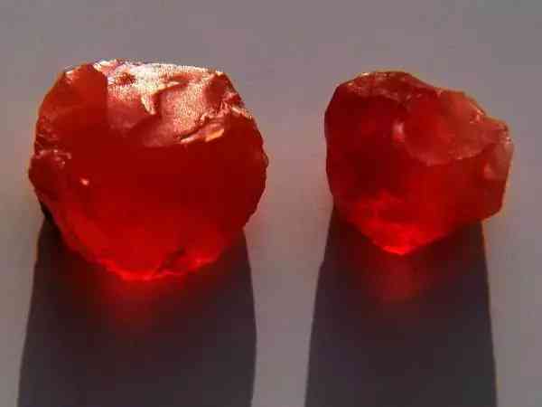 呈不规则块状,近扁圆形、圆柱形(为加工工艺品的多余部分)。红色、橙红色至深红色及乳白色、灰白色。条痕白色。半透明。表面平坦光滑,玻璃光泽;有的较凹凸不平,蜡状光泽。体轻,质硬而脆,易击碎,断面可见到以受力点为圆心的同心圆波纹,似贝壳状。具锋利棱角,可刻划玻璃并留下划痕。无臭,味淡。迅速磨擦不易热。以质坚、色红、透明者为佳。