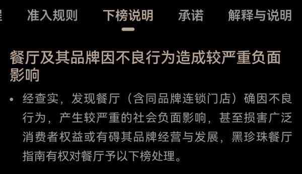 其中,餐厅准入规则“下榜说明”中明确,餐厅及其品牌因不良行为造成较严重负面影响,甚至损害广泛消费者权益或有碍其品牌经营与发展,黑珍珠餐厅指南有权对餐厅予以下榜处理。