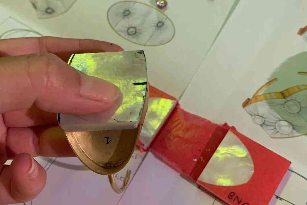 这种非常规的造型在切割时犹如在完成一件雕塑作品,这种造型厚度,又对珍珠母贝的厚度有着极高的要求,一旦切错重来,就要花费几个月的时间去寻找相同大尺寸和厚度的原材料。