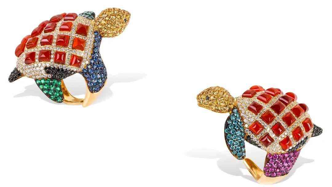 Rosior 海龟戒指 珊瑚、钻石、蓝宝石、祖母绿