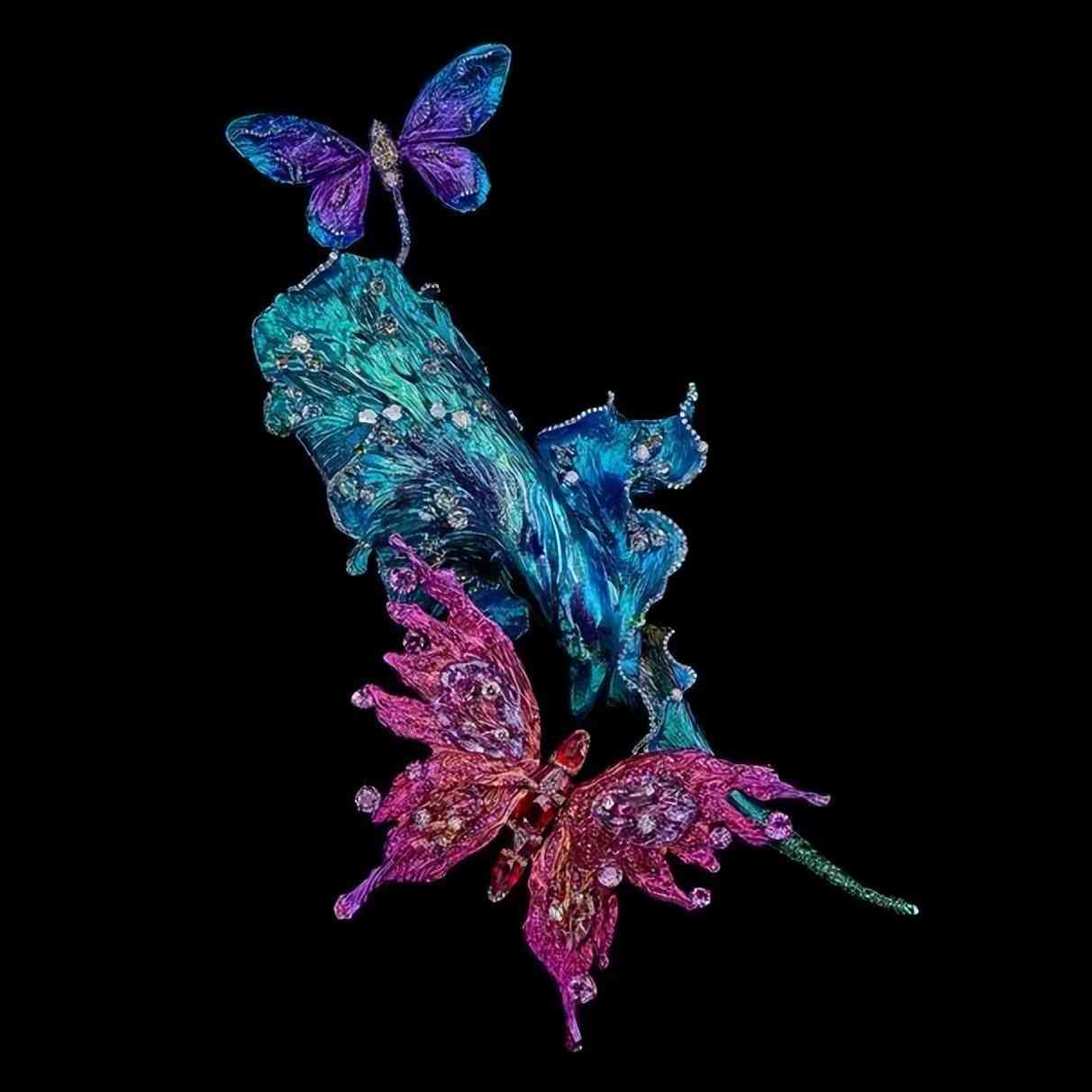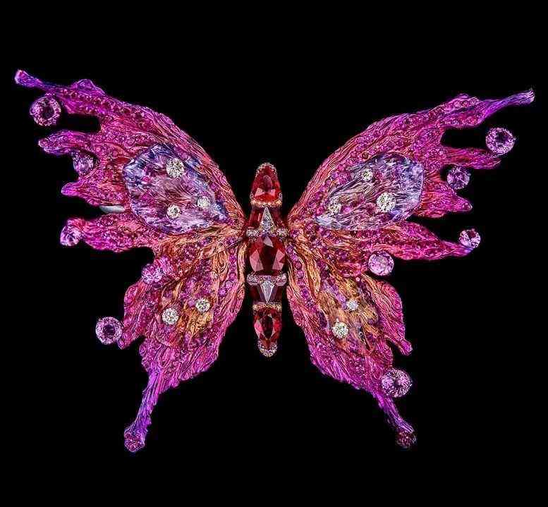 Wallace Chan 陈世英 My Butterfly Dream 可变形胸针 钛金、红宝石、蓝宝石、钻石、紫水晶、珍珠 沙弗莱石、石榴石