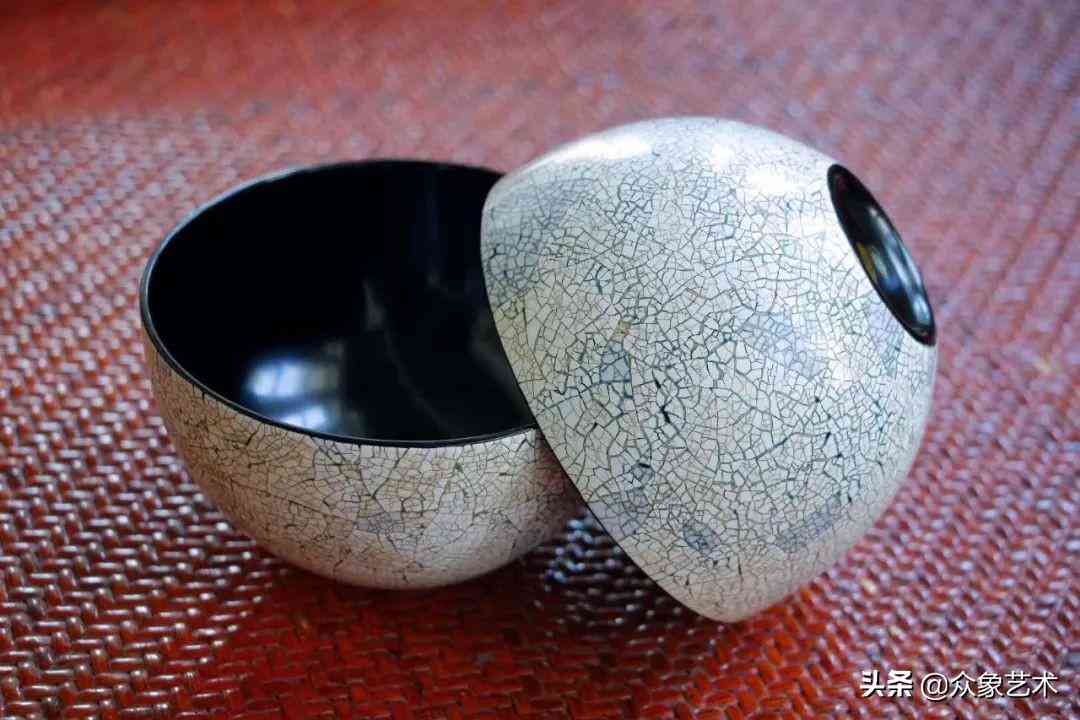 镶嵌技法中的蛋壳镶嵌用的是鸡、鸭、鹌鹑、鸽子等禽类蛋壳作为材料进行镶嵌,蛋壳不仅给漆艺带来了可贵的白色,它使漆艺从最黑(黑漆)到最白(蛋壳),另外,蛋壳自身的龟裂纹肌理,富有温和、朴雅之美。