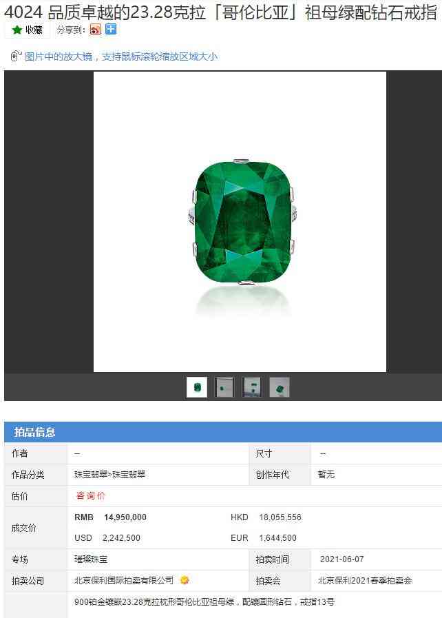 下面的哥伦比亚祖母绿配钻石戒指,就曾拍出了14,950,000元的高价。