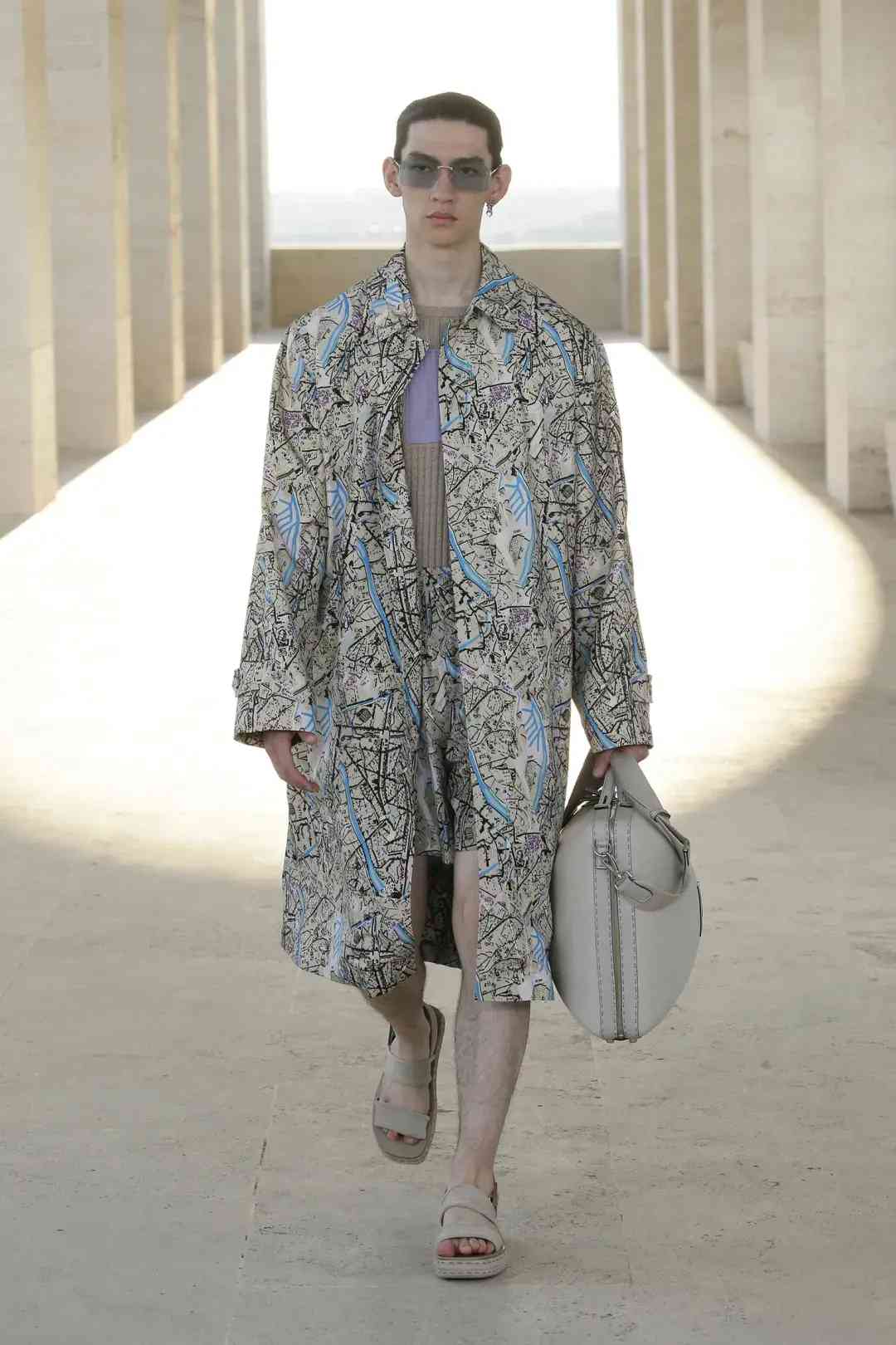 令人惊喜的是,这艺术感十足的图案印花是Fendi Land,灵感取自FENDI典藏档案中的罗马地图:FENDI Palazzo位于地图中心,台伯河流经迷宫般的建筑和街道,手绘FF logo随性点缀其间。这一幅手绘地图被大面积运用于短款夹克、风衣、这季标志性的工装口袋装饰短裤以及衬衫上。