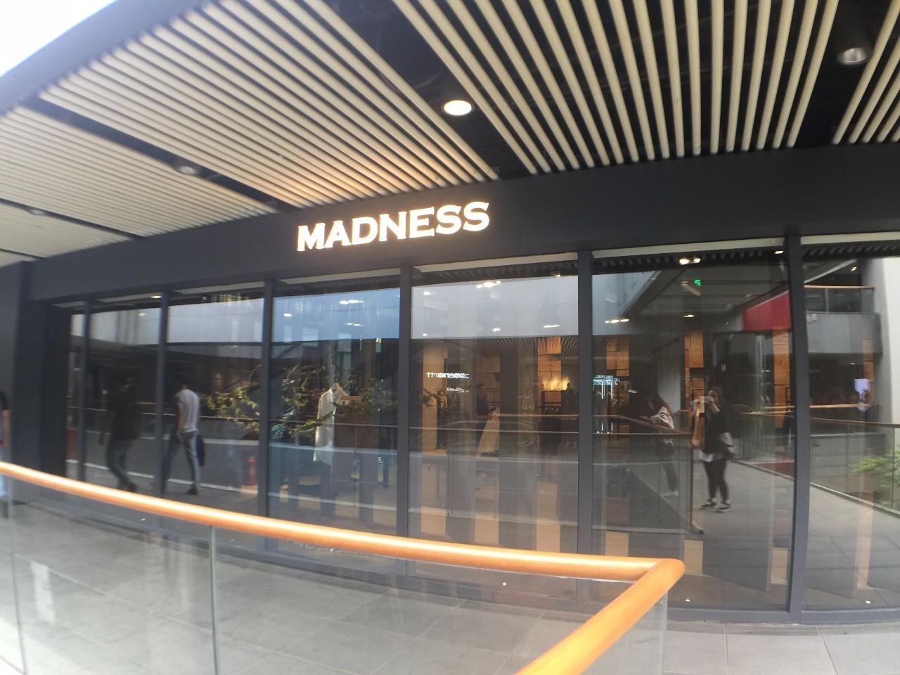 去年10月,Madness实体店在南区二楼开业。这也是品牌目前一家实体店。店铺装修采用木质与玻璃结合,有些神秘感。店铺风格、简洁的陈列方式等都有些日式风格的感觉。