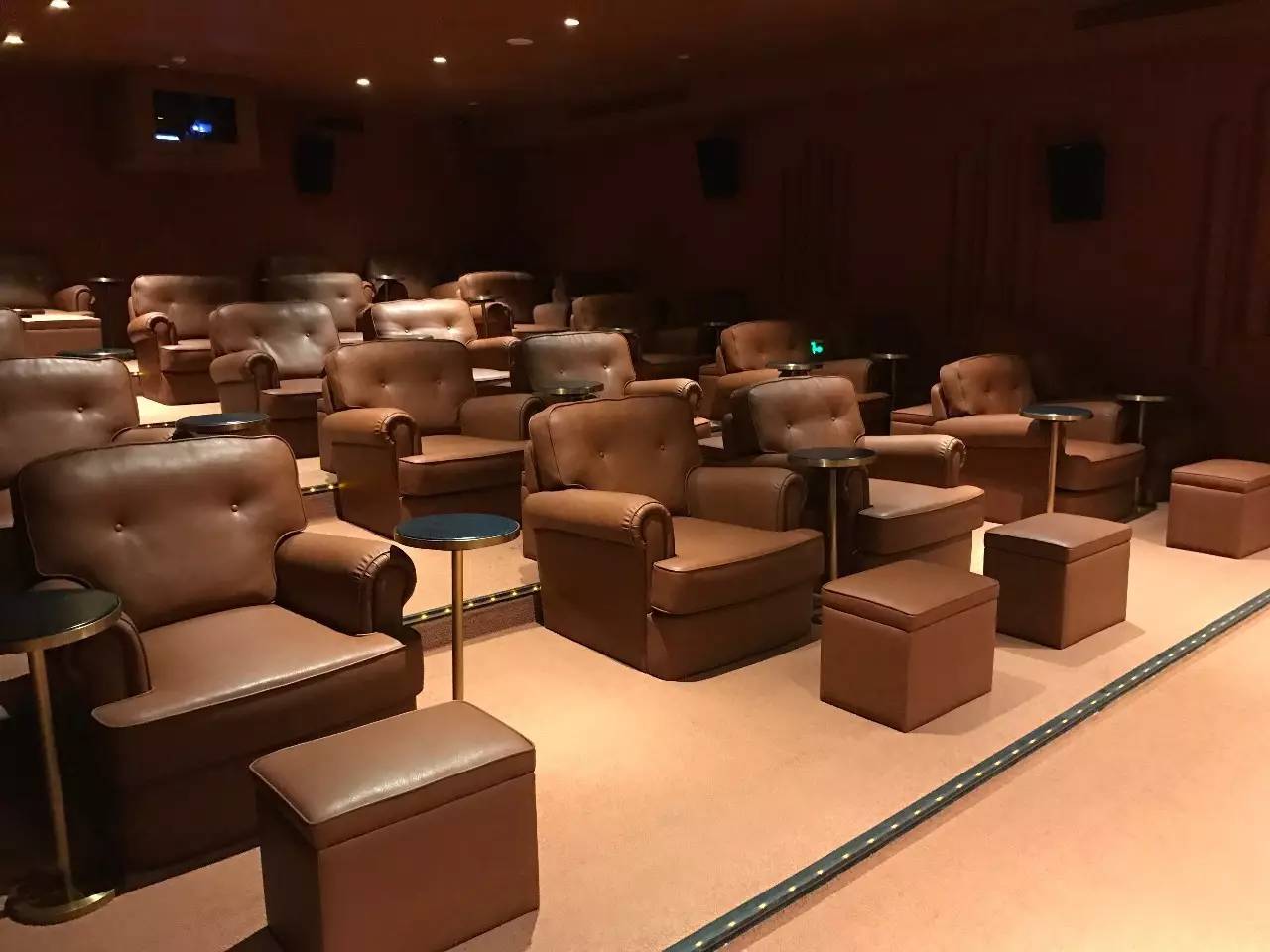 店铺内外的装修布置都很复古,有红色的餐椅、沙发、幕布,金色的吧台。一进店先是酒吧区,再往里是西餐区。此外,还有一大一小两个独立的放映厅,皮质沙发座椅看起来很舒适。