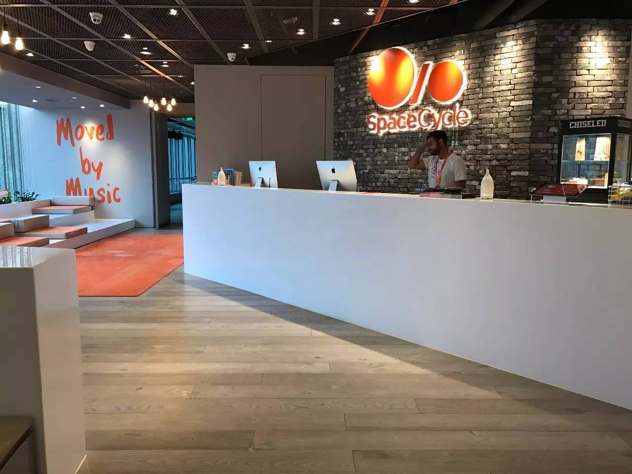 SpaceCycle大陆店在北区四层开业,店铺800多平方米,主打橙色,空间设计简洁、明亮。不过,室内单车的教室则是十足的夜店风。