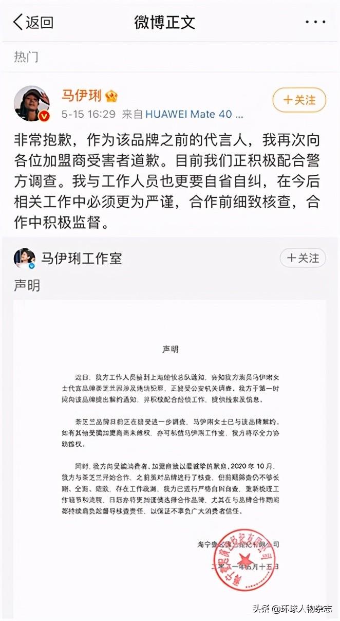 5月15日,马伊琍工作室在微博发布声明称,事件发生后,已于时间同品牌方解约,并向受骗的消费者、加盟商致歉。
