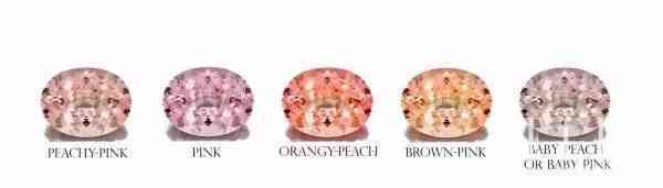 摩根石的颜色有粉红色、浅橙红色到浅紫红色、玫瑰色、桃红色。因含有锰元素而呈现如此明丽的粉红色。它清纯的粉色中又透着淡淡的橘色,从不同的角度观察,可发现桃色绿柱石呈现出偏向浅粉色和深些的蓝粉色这两种精致微妙的色彩。娇艳可人的外观,加之较低的产量,摩根石在国际上一直受到市场的追捧。