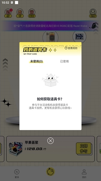 4、在【商品】页面可查看待提货等商品状态,仓库为空时可点击【去参与】获取商品。