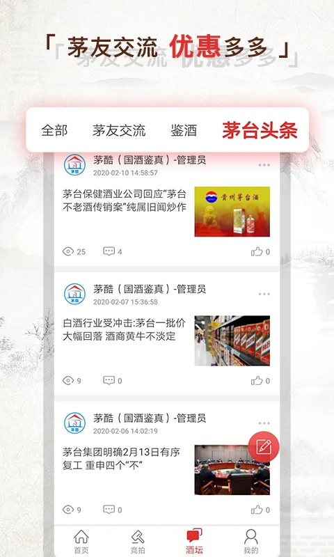 5、打造茅台酒坛专属交流社区,实时发布新鲜资讯、名家点评与防伪知识,便于爱好者深入交流心得与文化。