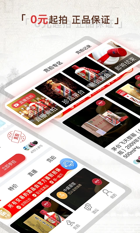 4、开设零元起拍的茅台正品拍卖专区,融入直播竞拍形式并伴有现金红包奖励,创造充满互动与优惠的竞购体验。
