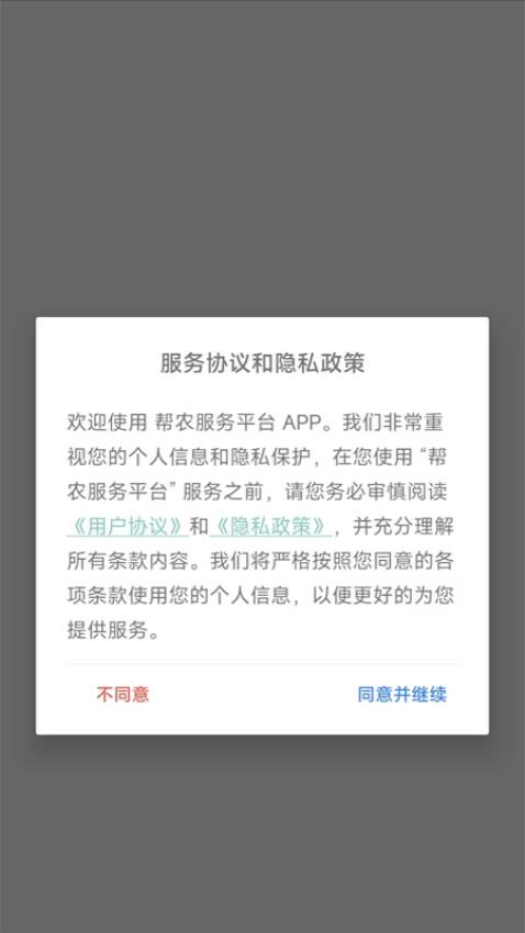1、阅读《服务协议和隐私政策》后,点击【同意并继续】进入应用。
