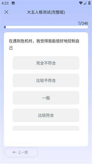 3、进入测试答题页,每题会呈现一个描述语句,需从完全不符合、比较不符合等选项中选择对应选项,完成当前题目的作答。