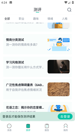 2、专业心理测评题库涵盖16种人格类型分析、压力指数评估等,所有测试均采用标准化量表并附专业解读。