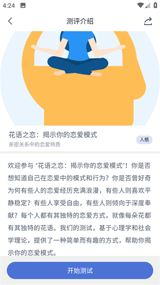 2、在测评介绍页面,能查看该测评的详细说明,了解其作用与意义,确认后点击开始测试按钮,即可进入测评答题环节。