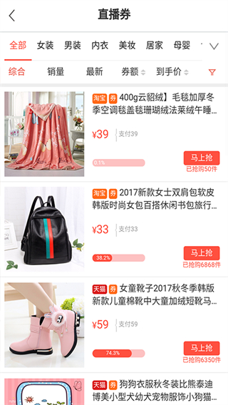 5、整体布局类似于精简版的电商首页,突出商品图片、价格、优惠信息和立即领券等核心行动按钮。