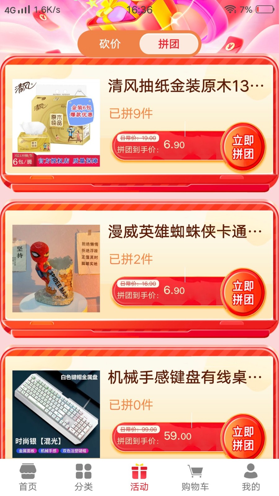 1、支持主动发起或参与商品拼团活动,聚集更多购买意向以享受专属团购价格,让社交分享与实惠购物紧密结合。