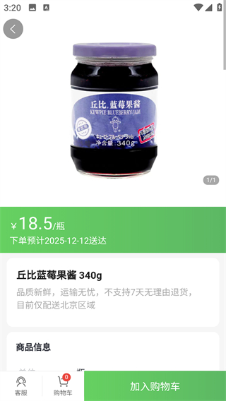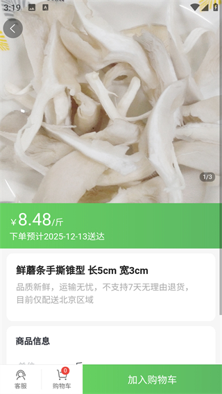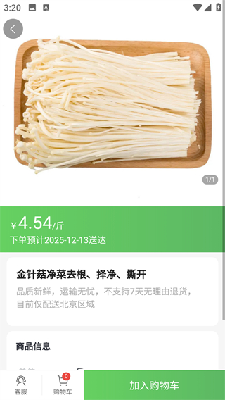 4、于商品详情页确认信息后,点击加入购物车按钮,即可将该净菜商品添加至购物车结算购买。