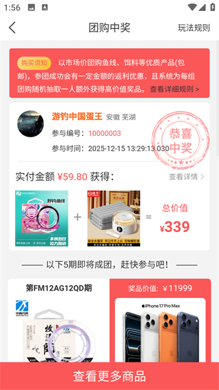 2、团购页面选择正在进行的团购活动,进入团购有奖页面,浏览当期的团购商品与奖品。