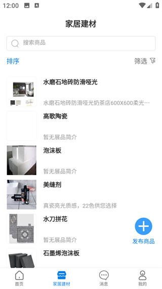 2、进入家居建材页面后,能看到各类建材商品列表,页面右侧有带加号的发布商品按钮。