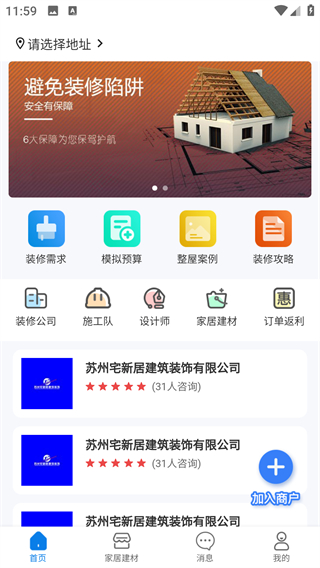 1、打开软件后,在首页可查看各类装饰公司信息,若要发布相关内容,需点击底部导航栏里的家居建材选项。