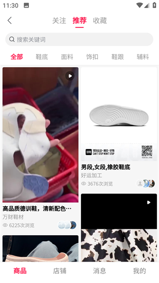 1、在鞋链宝首页,可选择找鞋料等功能入口,进入对应板块获取鞋材相关资源,满足鞋业全链路需求。