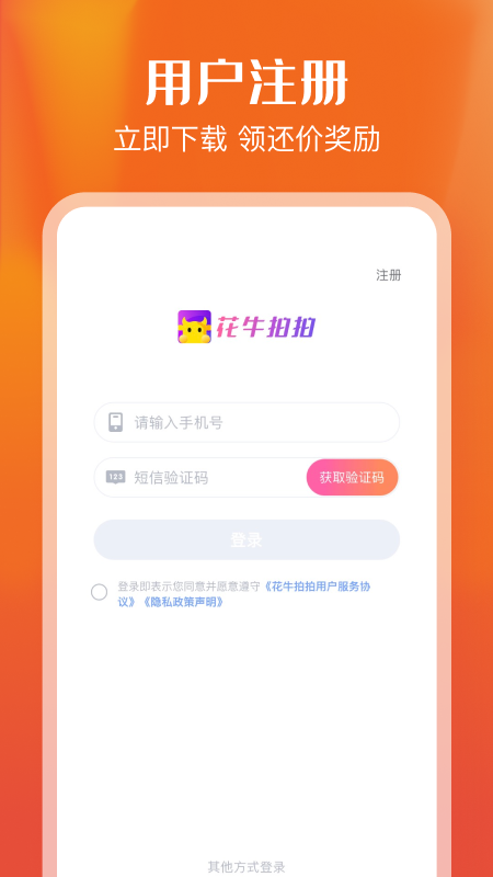 2、在花牛拍拍的登录页面,点击右上角的【注册】选项,进入注册页面。
