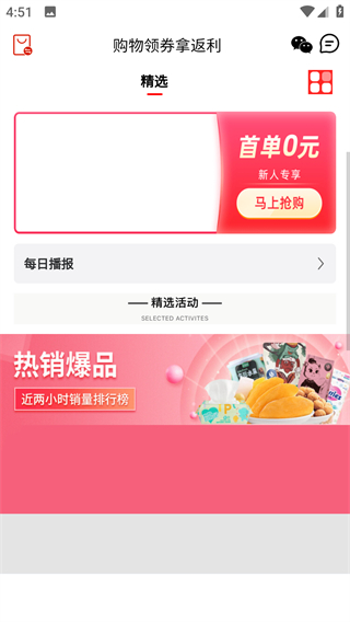 2、在购物功能页,选择对应服务入口,可进入相关平台的优惠页面,享受领券、返利等福利。