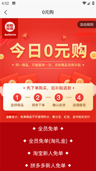 1、新人专享频道包含五十款零门槛免单商品,首单必中红包覆盖全部用户,连续签到七日可解锁隐藏福利专区。
