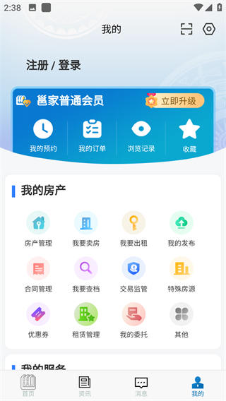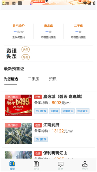 1、进入首页后,可看到新房、二手房等房产服务入口,点击新房选项,进入新房中心页面。