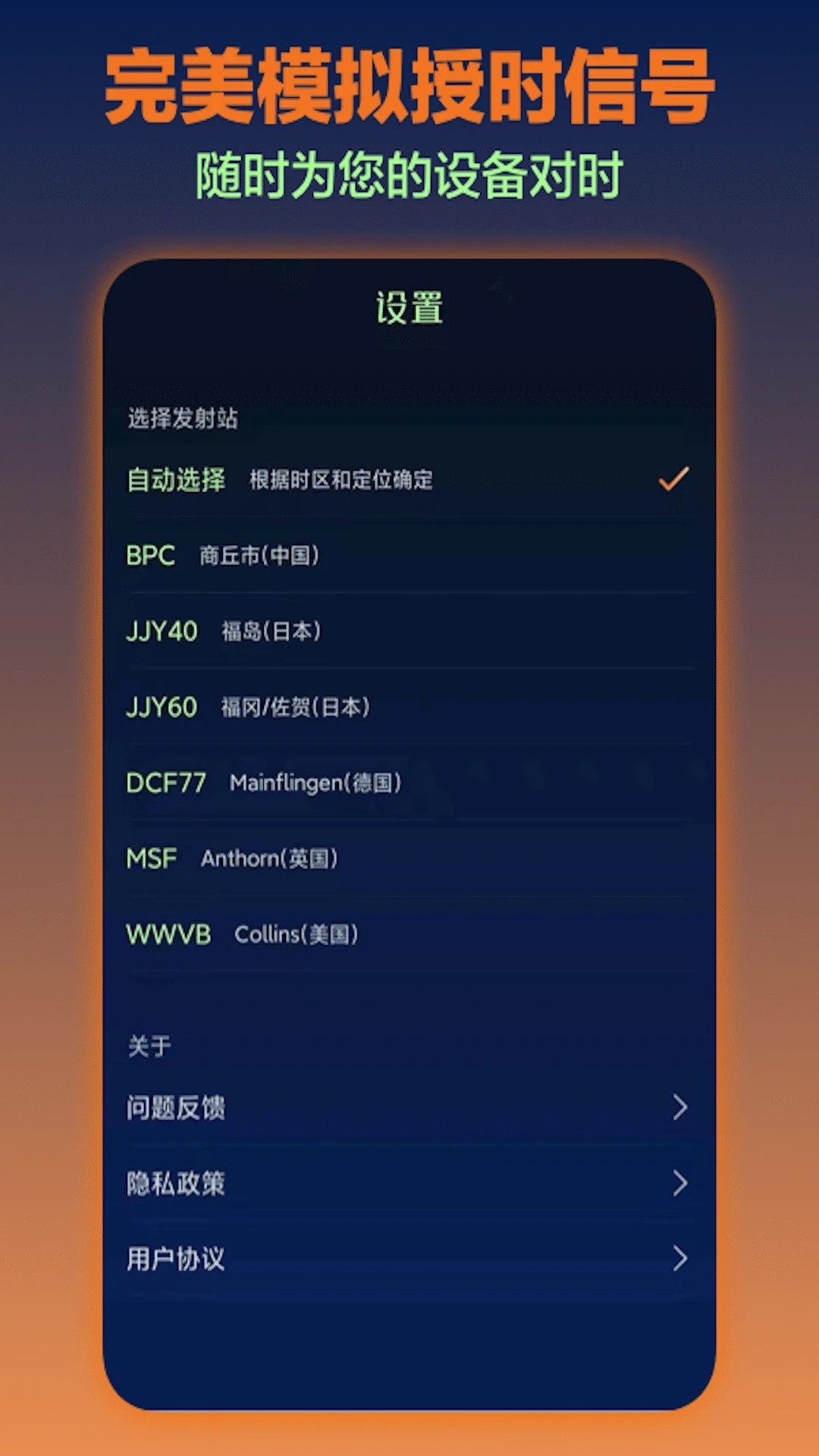 电波表对时是一款专为电波手表与电波钟设计的校准工具,能够模拟全球六座主要电波基站的授时信号。当您的设备因地理位置或环境因素无法接收到真实电波塔信号时,可使用此工具进行时间校准。无论身处何地,都能便捷地让您的钟表恢复至精准时间。界面设计简洁直观,操作流程经过大幅简化,确保使用过程既方便又高效。