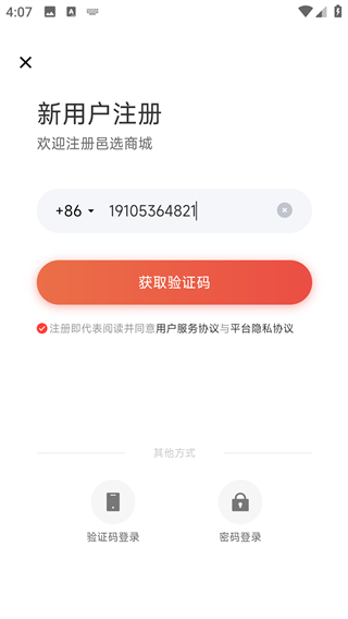 4、新用户注册页面,先输入需绑定的手机号,勾选协议后点击获取验证码,即可继续后续注册步骤。