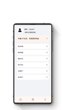3、切换到个人页面,可看到昵称及剩余使用次数,还有开通VIP意见反馈联系客服等功能入口。