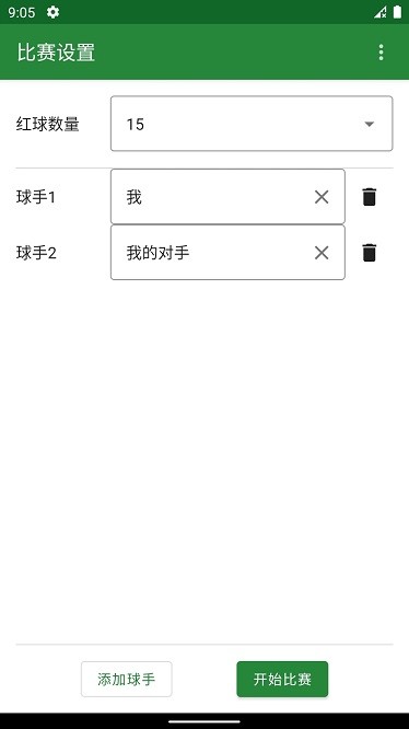 1、进入比赛设置页面,调整红球数量,填写选手1和选手2的姓名,也能添加更多选手。
