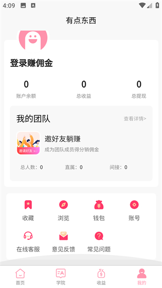 1、在首页底部选择对应选项,进入收益相关页面,可查看收益数据、推广计划等内容。