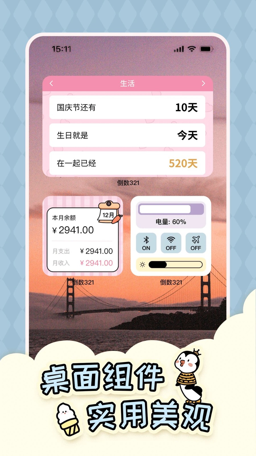 2、提供了丰富多样的个性化桌面小组件,允许用户自由选择样式与主题,将重要的日子直接展示在手机主屏,一目了然。