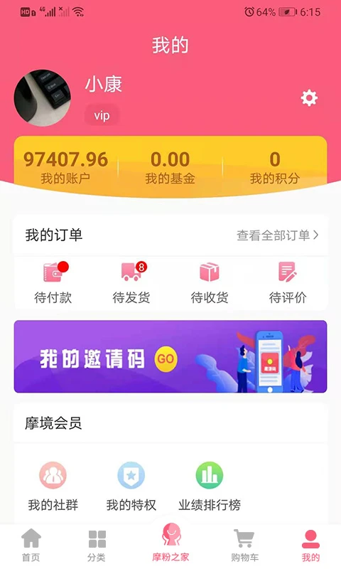 3、我的页面里可进行登录注册操作,查看我的订单相关状态,也能使用我的邀请码。